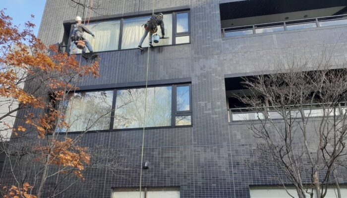 ロープを使った高所ガラス清掃は、特別教育を受けた資格保有者が対応。作業前にはハーネスやロープなどの用具を丁寧に点検し、安全を最優先とした作業を行います。