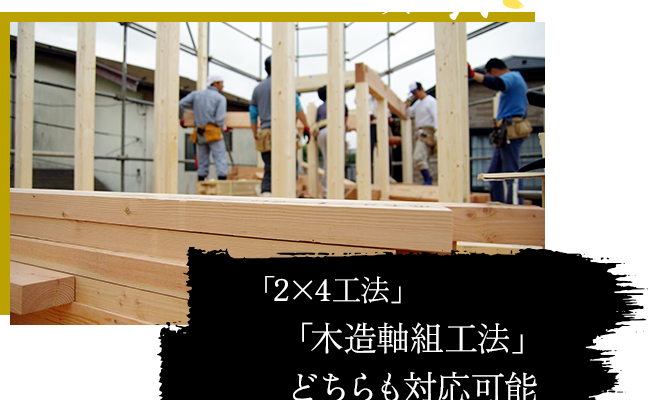 当方では建て方工事を行うにあたり、「2×4工法」「木造軸組工法」両方での対応が可能です。施主様のご要望に沿って、臨機応変に施工いたします。
