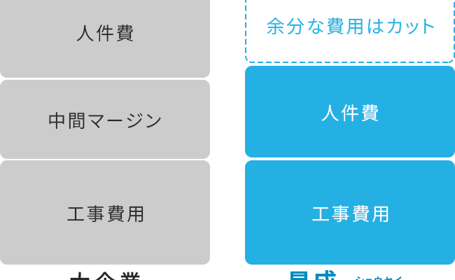大手の場合は下請け業者が工事を行うため、中間マージンという費用が工事費に加算されますが、当方はその中間マージンがかかりません。